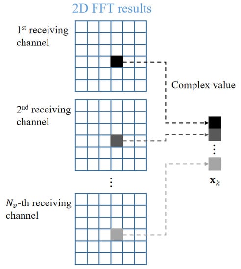 Finally, the angle of the target is estimated by finding the phase difference values of the received signals. For example, angle estimation algorithms, such as the conventional beamformer (i.e., Bartlett beamformer) [23], minimum variance distortionless beamformer (i.e., Capon beamformer), [24], multiple signal classification (MUSIC) [25], and estimation of signal parameters via rotational invariance techniques (ESPRIT) [26], can be used to estimate the phase difference. In general, these angle estimation algorithms can be applied directly to the time-sampled signals of each receiving channel [27]. In that case, we can estimate the incident angles of multiple signals received at the same time. However, it is difficult to pair the estimated angle values with the targets existing in the 2D FFT domain of Figure 5c. Thus, we use the angle estimation in the 2D FFT domain that accurately extracts only the angle information of each target [28], as shown in Figure 7. After 2D FFT of the signals received from each receiving antenna element, the values corresponding to the k-th target are collected and generated as a vector . Because the distance and velocity information acquired from each receiving antenna channel is equivalent for the same target, the signal values at the same indices from the 2D FFT results are selected. Basically, because the FFT is a linear transformation, the angle information of the target is included in the phase of the frequency-domain signal even after the 2D FFT. In other words, still contains the values of the phase difference between each receiving channel. Finally, we create the correlation matrix using , which can be expressed as