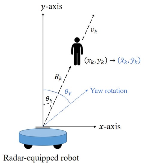 The distance obtained in Section 3.1 is the distance in the radial direction to the target based on the position of the radar-equipped robot, and the angle obtained in Section 3.2 is the angle between the front direction of the radar and the target, as shown in Figure 8. Therefore, the distance and angle information of the k-th target can be converted into the 2D position coordinates based on the radar position, which is expressed as
