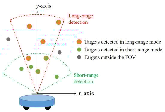 These 2D target detection results can be obtained in each of the two modes and they are finally combined, as shown in Figure 9. The detection result of the short-range detection mode is superimposed on that of the long-range detection mode. In the case of targets detected in both modes, the reliability of the detection result is high. However, in the case of a target detected only in one mode, the reliability may not be high. In the case of such targets, they can be removed through the target tracking. In addition, because the robot can perform circular rotation, targets outside the FOV can also be detected through its rotational motion.