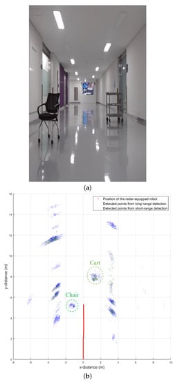 Measurement in an indoor environment: (a) a photograph of the environment; (b) accumulated detection results of the dual-mode radar.
