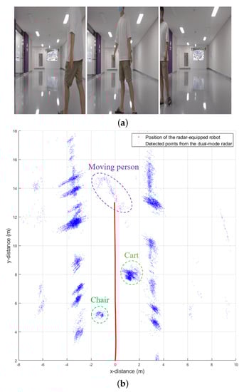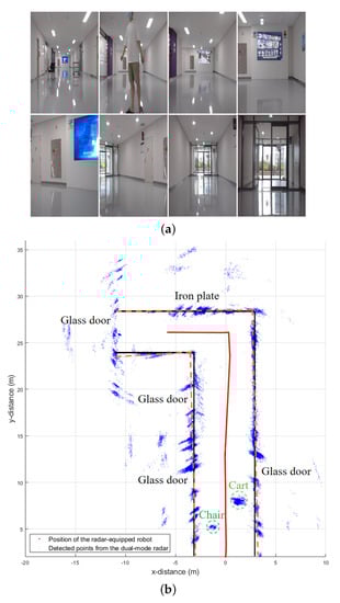 Measurement in an indoor environment: (a) photographs of the environment; (b) accumulated detection results of the dual-mode radar.