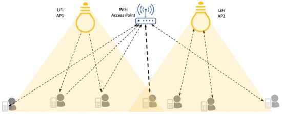 The advantages of VLC have been harnessed in the form of LiFi, which provides a complete wireless networking system []. The LiFi promises to use LED lights as access points (APs) and provide bidirectional high data rate communication and multiuser access with dynamic user associations. It is also expected to offer seamless mobility and interoperability with other networking systems such as WiFi and long-term evaluation (LTE) or 5G []. However, the LiFi has a higher penetration loss, and a significant portion of its gain comes from the line of sight (LOS) communication, making it difficult to be used as a standalone system. Therefore, the LiFi is a complementary technology to WiFi, thus forming a hybrid networking system. The hybrid system of LiFi and WiFi can be realized in two ways: Symmetric and asymmetric, as shown in Figure 1. In asymmetric hybrid systems, the downlink of LiFi is provided through VLC and the uplink is supported via WiFi. In symmetric hybrid system, the LiFi provides bidirectional communication in which the VLC provides the downlink communication, and the infrared provides the uplink. The hybrid network of LiFi/WiFi offers consistency in coverage, increase in capacity, and lower latency.