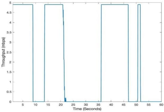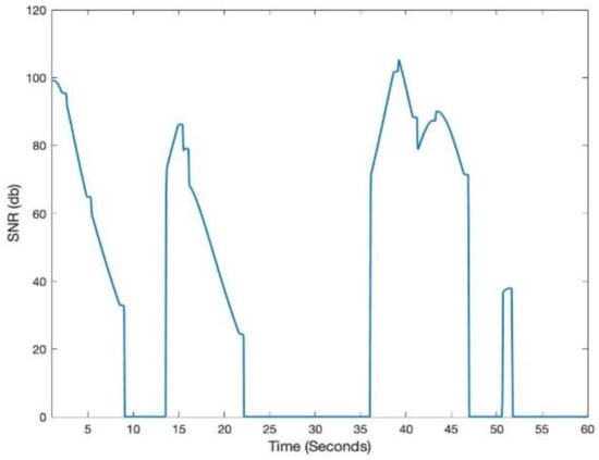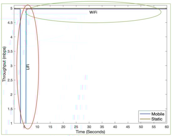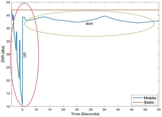 Figure 3 shows LiFi mobile user’s movement in a room area of 10 m × 10 m. In addition to the user movement, we have modeled the user device’s orientation according to the discussion in Section 3.3. Figure 4 shows the SNR and throughput for the first scenario. The mobile user experiences drastic variations in short bursts in SNR due to the user’s random mobility. The user mobility accommodates for the twin effects i.e., the user device directionality vis-à-vis the LiFi AP, and the distance from it. The changes in SNR performance are reflected in the throughput of the user, as shown in Figure 5. Since the user is not provided with a backup network (e.g., WiFi), the handover is not triggered, and thus the performance metrics are significantly affected. For the second scenario, we have considered a mobile and static user. The mobile user is initially connected to the LiFi AP but once it starts moving around, the SNR and the corresponding data rates/throughput drop significantly as shown in Figure 6 and Figure 7, respectively. On the other hand, the static user has a consistent gain. At around 5 s into the simulation, the SNR and data rate are not enough to meet the user requirement, therefore the user device starts the handover process by sending a request to the centralized controller (CC). The CC completed the handover process by re-adjusting the routes in the LiFi and WiFi APs and takes some time before the user SNR and data rates improve. Since the user is not connected to either of the networks during the handover process, it can incur some packet loss. However, although there is some packet loss, the instantaneous parameters-based handover ensures that the user device has connectivity, even if it is mobile and experiencing sudden fluctuations in SNR. This shows that when we provide LiFi with a backup system in the form of WiFi, its performance metrics improve significantly.