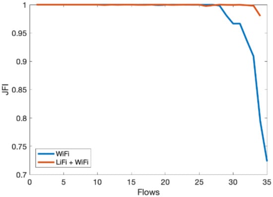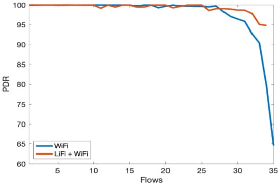 In the third scenario, we evaluate the overall performance gain of the hybrid LiFi and WiFi network. We consider an indoor network consisting of multiple users with Flows ranging from 1 to 35. Flows are unique TCP/UDP connections and are widely used in the literature to represent users; therefore, users and flows are exchangeable. We have limited one flow to one physical user. However, multiple flows can originat from a single user and it will have the same effect. The throughput of the hybrid system is shown in Figure 8, which shows significant performance gain over the WiFi-only system as the contention over WiFi channels decreased due to traffic offloads to LiFi. In Figure 9, similar performance gains can be observed for per-user delay vis-à-vis increase in the number of flows. Figure 10 shows that the fairness index remains stable with an increase in the number of flows in the hybrid network. Lastly, PDR results show that the hybrid system can avoid congestion due to multiple contending stations for the network resources, as shown in Figure 11. As the number of users increases, the WiFi-only system starts dropping packets, while in comparison, the hybrid system delivers much more of the packets successfully to the network end users. The difference in PDR becomes more pronounced as the number of users increases beyond 15.