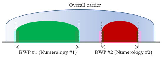 Another feature included for NR is the Bandwidth Part (BWP) concept. BWP enable more flexibility in how resources are assigned in a given carrier. With BWP, a carrier can be subdivided and used for different purposes. Each BWP has its own parameters including bandwidth and numerology. Bandwidth is configured for each user equipment (UE) depending on its capabilities to support a maximum supported bandwidth and therefore, several UEs that have different capabilities can be served on a single broadband NR bearer. Moreover, multiple BWPs with different numerologies can be multiplexed within an NR bearer to support different types of services, as