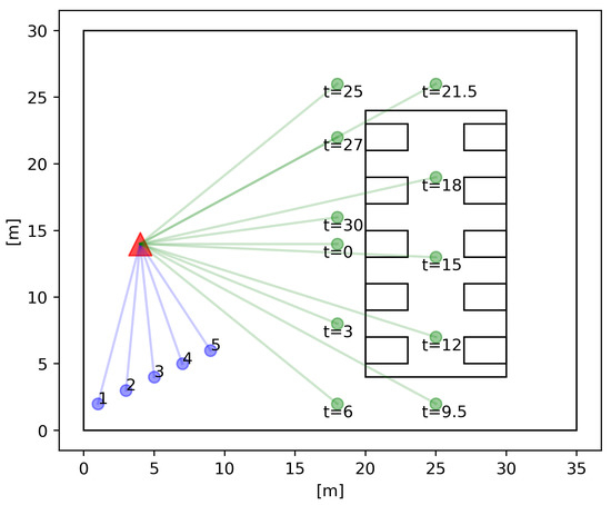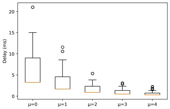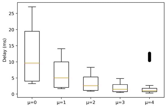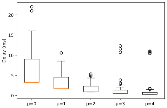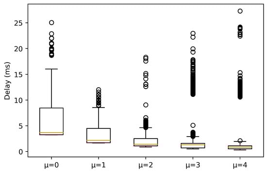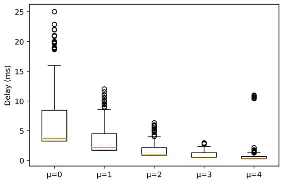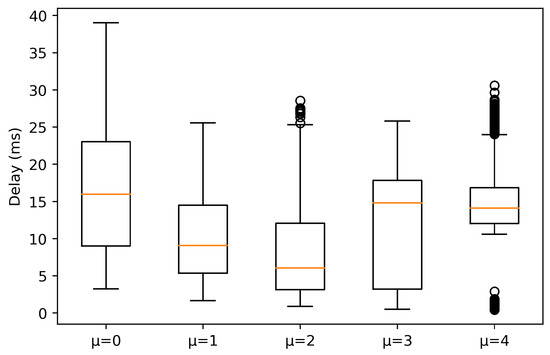 On the other hand, under NLOS conditions, significant differences are observed. A remarkable difference is a high increase in the median for all numerologies, being more accentuated for = {3, 4}. Please note that for = 4, the 25% and 75% percentile tends to be symmetric about the median. However, outliers exist, reaching values above 25 ms and below 5 ms. On the other hand, for = 3, the 25% and 75% percentile tends to be asymmetric about the median. This clearly indicates that the data below the median present higher variation. Under this condition, = 2 obtains a median value of 6.041 ms, although there are outliers between 25–30 ms. Also, = 1 presents a similar behavior as = 2, but with a higher median value (9.062 ms). Finally, for = 0, it can be observed that the 25% and 75% percentile tends to be symmetric about the median and the median value is the highest. This indicates that this numerology is not suitable for AGV control, due to the delay distribution, where the 25% percentile is around 10 ms, which is not desirable for URLLC.