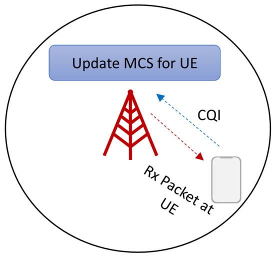 Figure 5. Upon a packet reception at the UE side, the UE measures the average SINR received for each packet chunk and then, based on this measure, the UE selects a CQI value, which is a scalar value from 0 to 15 that indicates how good or bad was the reception. Afterwards, the UE sends the CQI value to the gNB. When the gNB receives the CQI, it updates the MCS to be used in the next allocation for this UE according to CQI value. A robust MCS produces an increase in the delay, as OFDM symbols carry less bits, so it will be necessary more symbols to be allocated. The second one is related to the cell load level, where upon the arrival of a packet at MAC layer it may be the case of not having enough resources to allocate all the data in the current slot, having to wait for the next slot to allocate the rest of the data. The reason this occurs is because all traffic is treated fairly, i.e., there are no preferences for one traffic over another in the scheduler decision.