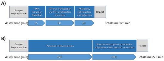 Flowchart and timeline of the SARS-CoV-2 diagnostic workflow for CovidArray (A) and standard reverse transcription-quantitative polymerase chain reaction (RT-qPCR) assay [28] (B).