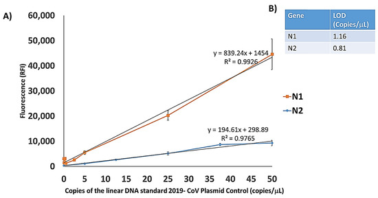 The LODs (lowest concentration of detectable plasmid DNA) extrapolated for each marker are reported in Figure 4B. The determination of LOD is based on the equation: 3.3 σ/s where s is the slope of calibration curve and σ is the standard deviation of fluorescence background in the control sample. The LODs found with this system are 1.16 copies/μL for the N1 and 0.81 copies/μL for the N2, respectively. These LODs are comparable with those declared by the various manufacturers of kits for qPCR with the difference that the number of standard amplification cycles for those methods is 40 while, in our approach only 25 cycles are sufficient to detect the target genes.