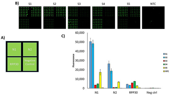 Figure 2B shows the results of the microarray analysis of the swab samples and the control NTCs for the SARS-CoV-2 markers (N1 and N2) and for the RPP30 positive control.