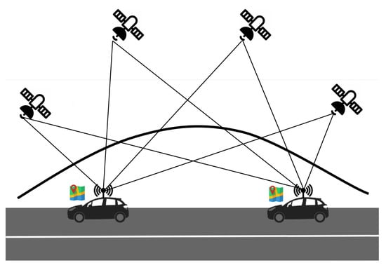 Today the navigation systems are considered an integrated part of the Intelligent Transportation System (ITS) and Vehicular Ad-Hoc Network (VANET) system [5]. The vehicles are equipped with GPS receivers and, in the next future, all vehicles will have a GNSS receiver on board [6,7]. In Figure 1 a typical scenario of global position system in a VANET environment is shown.