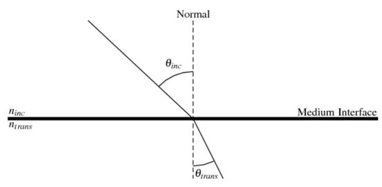 Example of the refraction phenomenon of the signal where and are the refractive indices of the incident and transmitted medium, respectively.
