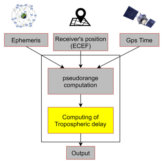 In this work the Troposphere Collins model [14] has been chosen for the implementation. This model is also used by Satellite-Based Augmentation System (SBAS) for maximum precision differential corrections, with the aim of increasing the accuracy and integrity of the GPS system data, such as the Wide Area Augmentation System (WAAS) and European Geostationary Navigation Overlay System (EGNOS), that are air navigation aids developed to augment the GPS, with the goal of improving its accuracy, integrity, and availability. The model provides an estimate of the zenith total tropospheric delay that is dependent on empirical estimates of five meteorological parameters at a receiver—namely, pressure, temperature, water vapour pressure, temperature lapse rate and water vapour lapse rate. These estimates of the meteorological parameters are dependent on the receiver’s height, latitude and day-of-year, and are interpolated from reference values for the yearly averages of the parameters and their associated seasonal variations.