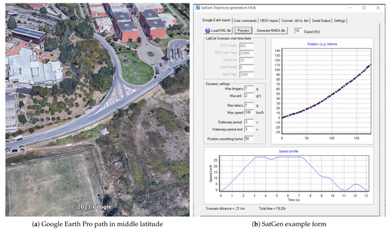 A brief description of used hardware and software components are provided in the following. The sending device uses the HackRF One card with the ANT500 antenna and the Nooelec Module Tiny TCXO 10 Mhz module, a very precise oscillator with very low phase noise. It has been chosen from the various options available for the HackRF One card in order to use GPS applications (see Figure 4). An Android smartphone (Samsung Galaxy S4) with the NMEA GPS software was used as the receiving device, which returns the GPS data in NMEA format (see Figure 4). A path consisting of eleven points on the map and then converted into NMEA format, to be simulated with the GPS-SDR-SIM software has been created using Google Earth Pro software. From Google Earth Pro software, once a path has been choose, it is possible to generate a “KML” file which is then passed to another software: SatGen [31] in order to create the NMEA strings, see Figure 5. KML stands for Keyhole Markup Language is a file format used to display geographic data in an Earth browser such as Google Earth. The software interface allows to set in the form “Dynamic settings” some parameters regards the dynamic of the receiver by setting information about different accelerations and max speed that we have set to 100 km/h. Moreover, in the first graphic it is possible to view the path created in Google Earth Pro and in graphic below the speed profile of the receiver. The update rate for the route can be defined from 1 Hz to 100 Hz, this will defined the granularity of the route created in the software. We have set it to 10 Hz. This means to create 10 NMEA strings to each second.