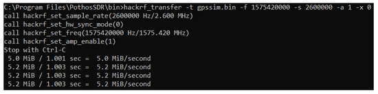 Subsequently, the simulator output file has been transferred in input to the HackRF One board using Windows 10 command as shown in Figure 6.