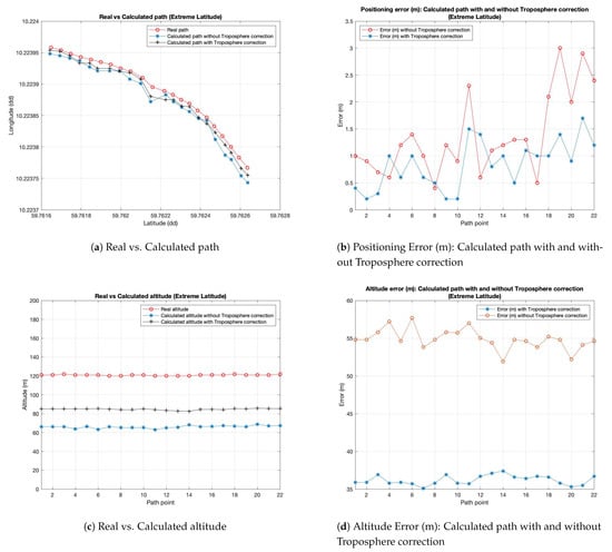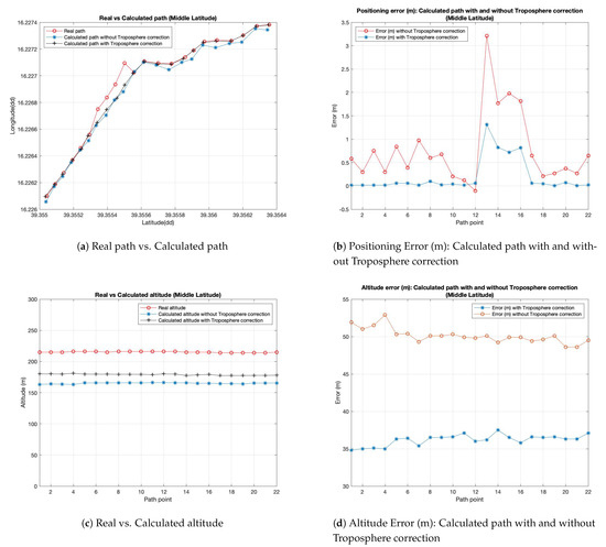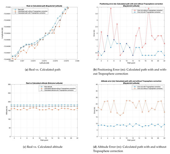 The third campaign is related to experiments considering equatorial latitudes. As it is possible to observe in Figure 9a–c, the results show how the obtained curves have the same trend of the previous cases. Comparing the graphics of the different campaigns, it is possible to observe a better behavior of the system at equatorial latitudes in respect to extreme ones. The graphics show an error lower in the equatorial case. Instead, taking into account extreme latitudes, an higher difference between the “real path” curve in respect to the simulated one (using the troposphere model) is possible to observe.