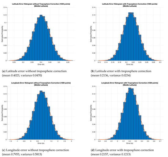 Finally, in Figure 10 we present the estimated probability density functions, the histograms for a considered Middle Latitude experiments on a path of 1.8 km and taking into account 1500 path points. The graphics show that the errors distribution are very similar to the normal/Gaussian distribution. These figures prove that the model is correctly representing a GPS signal and, in particular, they show how the error committed by simulator considering the proposed module implementing the Collins model is lower than considering experiments without the troposphere correction module. In particular, Figure 10a represents the estimated probability density function for the latitude error committed without troposphere correction. It is possible to note a error range between about 0.25 to 0.55 m, with a mean of 0.4023 m and a variance of 0.0470 m. Figure 10b shows the latitude error range for experiments with the troposphere error compensation. In this case, it is possible to observe a lower error range with value between 0.12 and 0.3 m, with a mean of 0.2136 m and a variance of 0.0234 m. Instead, Figure 10c,d represent the estimated probability density function for the longitude error committed without troposphere correction and with troposphere correction, respectively. It is possible to note an error range between about −1.5 to 3 m, with mean of 0.7953 m and variance of 0.5813 m in the first case and an error range with value between −0.3 and 0.7 m, with mean of 0.2136 m and variance of 0.1213 m for the second one.