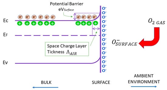 The formation of oxygen ions results in the capture of electrons from conduction band of the surface layer, determining an alteration in conductivity of the MOS [52]. The increase or decrease in conductivity depends on the type of majority carriers in the semiconducting metal oxide material (n-type or p-type) and on the nature of the probed gas molecules (oxidizing or reducing). In the case of n-type nanostructured oxides, the electrons are “removed” from the conduction band of the surface layer thanks to the action of the adsorbed oxygen molecules. In this way, negatively charged chemisorbed ions will be formed. In particular, at room temperature, surface oxygen ions will be type [51]. Consequently, we have the formation on the oxide surface of a depletion zone and a potential barrier, which produce a decrease in conductivity or, analogously, an increase in the resistance of the oxide layer, due to the loss of electrons [53].
