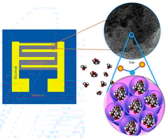 Schematic design of a gas sensor based on meso-nanoporous metal oxides. The device takes advantage from the porous structure and large specific surface area of the material to enhance the sensing performances. Reprinted under the terms of the Creative Commons Attribution License from Ref. [44].