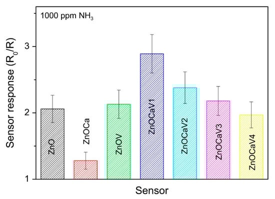 Detection response of 1000 ppm of ammonia for the investigated sensors. Reprinted from Journal of Solid State Chemistry, Vol 226, Fazio E. et al., Ammonia sensing properties of V-doped ZnO:Ca nanopowders prepared by sol–gel synthesis, Pages No. 192–200, Copyright (2015), with permission from Elsevier [67].