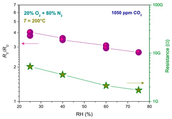 Relative humidity (RH) effect on baseline resistance (right y-axis) and response (R0/RG, left y-axis) of nanofibers-based sensors. Reprinted with permission from Pantò, F. et al., CO2 sensing properties of electro-spun Ca-doped ZnO fibers. Nanotechnology 2018, 29, 305501 [76].