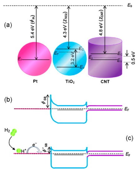 Schematic band diagrams for (a) Pt, TiO2 (large gap n-type semiconductor) and CNTs (p-type semiconductor), and (b) Pt/TiO2/CNTs nanocomposites. (c) Drawing for the charge transfer occurring after H2 dissociation and characterizing the sensing mechanism. Reprinted from Sensors and Actuators B: Chemical, Vol 178, Santangelo S. et al., On the hydrogen sensing mechanism of Pt/TiO2/CNTs based devices, Pages No. 473–484, Copyright (2013), with permission from Elsevier [81].