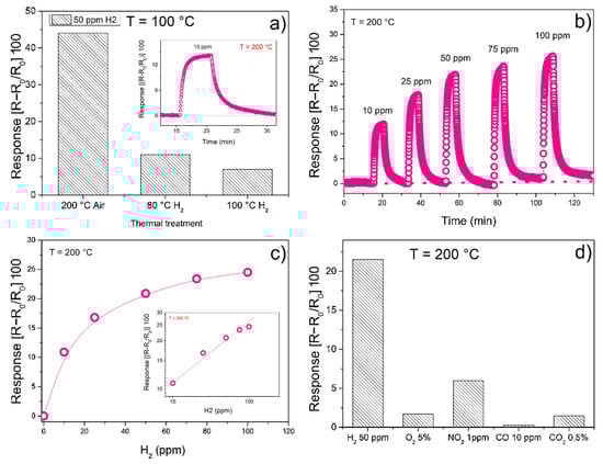 However, the sensor based on the film annealed in air at 200 °C was the most responsive, as indicated by the sensing response reported in Figure 8b. A completely reversible behavior was seen for low concentration of H2 (10 ppm), also for medium-high humidity levels. Moreover, this sensor shows a good stability after repeated cycling and the sensing response to 50 ppm of H2 was much higher than that to other simple gases tested including CO, CO2, NO2 and O2 (Figure 8d).