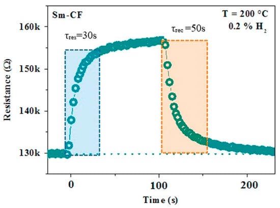 Transient response of the Sm-Cobalt ferrite (Sm-CF) sensor, showing the response/recovery time. Reprinted from Ceramics International, Vol 43, Falsafi F. et al., Sm-doped cobalt ferrite nanoparticles: A novel sensing material for conductometric hydrogen leak sensor, Pages No. 1029–1037, Copyright (2017), with permission from Elsevier [91].