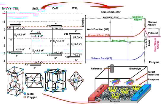 Generally, wide band gap semiconductors are used to construct such biosensors due to their unique crystalline structures and physical properties (electrochemical, optical, electronic, gravimetric and piezoelectric) [108]. The other advantages of MOX include their specific chemical composition, crystallization degree and that the interaction pathways between their surface and the analyte can be tuned to achieve a proper displacement of Fermi energy and induced depletion [109]. In fact, physico-chemical properties of the semiconductor surface are altered by the interactions with the analytes and corresponding changes can be correlated with the specific induced stimuli [110]. Furthermore, the biosensor surface can be functionalized to offer super hydro–phobicity/philicity, self-cleaning, antimicrobial activity and selective response to external stimuli such as light exposure [111].