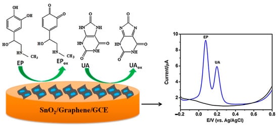 Schematic representation of the SnO2/graphene modified glassy carbon electrode for simultaneous detection of epinephrine (EP) and uric acid (UA). Reprinted from Sensors and Actuators B: Chemical, Vol 221, Lavanya N. et al., Simultaneous electrochemical determination of epinephrine and uric acid in the presence of ascorbic acid (AA) using SnO2/graphene nanocomposite modified glassy carbon electrode, Pages No. 1412–1422, Copyright (2015), with permission from Elsevier [128].