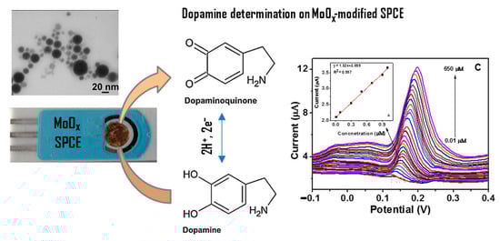 The combination of the efficient electron redox capability of pulse laser ablation (PLA) synthesized MoOx NPs colloids with the fast electron transfer rate of screen printed carbon electrode (SPCE) emerged as a good possibility for obtaining sensitive and selective detection of DA, excluding any interference from ascorbic acid [130]. This is explained on considering the high surface to volume ratio and Mo participation to surface oxidation processes. Figure 13 reports a schematic picture of the electrochemical oxidation of DA using MoOx NPs/SPCE structure. In this case, the DA content is detected without any electron transfer mediator (such as graphene, carbon nanotube, etc.).