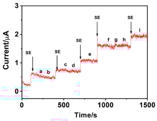 Amperometric response of MnO2-graphene (GR) modified glassy carbon electrode (GCE) for the addition of 50 µM serotonin (SE) and successive addition of interferents 500 µM each in the sequence of (a) DA, (b) EP (c) folic acid (FA), (d) UA, (e) AA, (f) glucose (g) Na+, (h) K+ and (i) Mg2+ in 0.1 M PBS buffer. Figure reused under the terms of CC-BY license from Ref. [133].