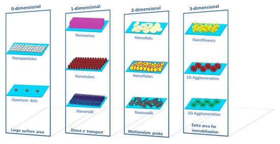 Four different dimensions of ZnO nanostructures with their advantages. 0D nanostructures provide large surface area. 1D nanostructures possess stable and direct electron transport. 2D nanostructures give specific planes for immobilization process for the simultaneous detection of different analytes. 3D nanostructures have extra surface area (outer and inner area) to provide more sites for immobilization.
