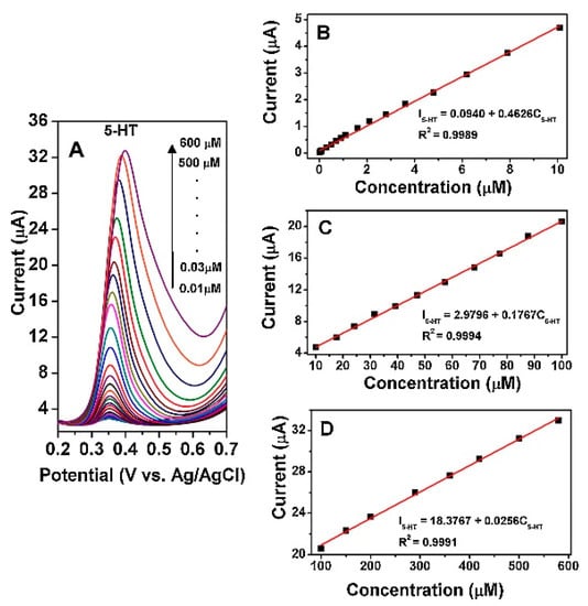 Regarding serotonin (SE) detection, MnO2 nanoparticles have been anchored on graphene (GR) support, yielding MnO2-GR composite with a large surface area, improved electron transport, high conductivity and numerous channels for rapid diffusion of electrolyte ions [133]. Indeed, even if MnO2 is one of the most promising transition MOX for electrochemical applications due to its non-toxicity, environmental compatibility and low cost [134,135], it is characterized by relatively poor electrical conductivity.