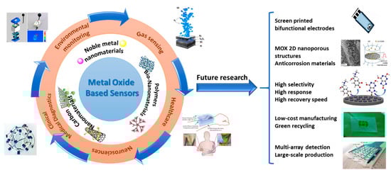MOX materials find large applications also in the fabrication of biosensors. Such devices consist of sensitive biometric elements, transducers and signal analysis systems allowing the rapid detection of various trace-level analytes [16]. The sensitive element selectively reacts (enzyme) or binds (antibody) with analytes. Therefore, the transducer captures the results of the interaction between sensitive material and analyte. These could be changes in number of transferred electrons in the case of redox enzymes or changes in mass or potential for various sensors based on immunosensing principles. However, for their biosensing applications there are several issues to overcome such as organic/inorganic interface compatibility, increasing the carrier charge mobility, while decreasing the electron-hole recombinations. Furthermore, for an effective commercialization, an important prospect is the prolongation of lifetime of the sensors, as well as the stability and reliability of the sensor signal, especially in humid conditions. Thus, a great deal of researchers’ attention will be focused on novel inorganic nanomaterials.
