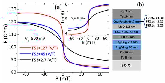 To investigate the influence of bias voltage on the sensing characteristics, we fabricated sensors with the same properties but with significantly different field sensitivities (Figure 1a). We designed sensors using perpendicular magnetic anisotropy in the sensing layer (SL) []. To achieve sensors with different field sensitivities (FS), such that FS1 > FS2 > FS3, we used sensing layers with thicknesses (tSL) as follows: FS1:tSL = 1.30 nm; FS2:tSL = 1.25 nm; and FS3:tSL = 1.20 nm. The thinner sensing layer induced stronger perpendicular anisotropy, which resulted in larger saturation field of the layer (saturation field ~1/tSL). The larger saturation field caused the lower slope of the transfer curve, thus lower sensitivity. Moreover, the thinning of the sensing layer reduces the TMR ratio. Both of these changes contributed to the modification of the sensitivity through the sensing layer thickness. More details on the sensor design can be found in [,,,,].