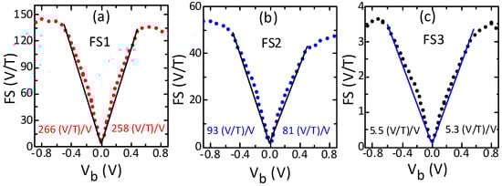 Bias voltage influence on the field sensitivity (FS) of the sensors with high (a), medium (b) and low (c) sensitivity. The sensitivity increases linearly up to a certain bias but with higher rate under negative polarity. It also reaches a higher maximum value under negative polarity. The linear ranges of sensitivity were determined by fitting the linear model to the measured data using the least squares method. Solid lines represent the linear fits and the dotted lines are the experimental results.