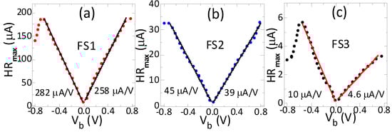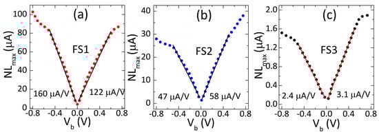 The maximal nonlinearity (NLmax) of the sensors increased strongly with bias magnitude, but at higher rate for positive bias polarity than negative (Figure 3). The change in the maximum nonlinearity with bias was correlated with field sensitivity—the higher the sensitivity (Figure 2), the higher the rate of increase of the nonlinearity with bias (FS1: 160 μA/V to FS3: 2.4 μA/V). The rate of increase was lower by a factor of 1.3 under negative bias, except for the highest sensitivity sensor (FS1), where it was lower under positive bias. The nonlinearity changed from the minimum to the maximum by a factor of 26, 20 and 10 for FS1, FS2 and FS3, sensors, respectively. Moreover, it increased approximately linearly with the bias up to 0.4 V–0.5 V (Figure 3). Above this bias voltage, the increase in the nonlinearity was not monotonic. Again, the sensors under negative bias showed lower nonlinearity values, except for sensor FS1. In contrast to the sensitivity, the nonlinearity deteriorated (increased) with the bias of both polarities. It increased strongly, but the increase rate and the highest values of the nonlinearity were significantly different for negative and positive bias. These results indicate the deterioration of nonlinearity regardless of bias polarity, but at a lower rate under negative polarity for most sensors.