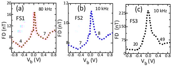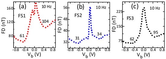 The low-frequency field detection of all sensors improved (declined) strongly with bias, reaching the lowest value for a specific bias and under negative polarity (Figure 5a–c). The low-frequency field detection declined with bias of both polarities by a factor of 1.1 to 3.9. The reduction was higher under negative bias and the highest (3.9) for sensor FS3. Importantly, all sensors showed the minimum field detection under both polarities for the same magnitude of 0.5 V. For all sensors, the minimum field detection was lower under negative bias. The minimum field detection differed most significantly (by a factor of 1.7) between the two polarities again for sensor FS3. In contrast to nonlinearity and hysteresis, the minimum field detection (31 nT) was shown in neither the highest field sensitivity sensors (FS1) nor the lowest field sensitivity sensors (FS3), but in the medium sensitivity sensors (FS2). This is consistent with the previously reported results [] and implies that the increase in field sensitivity with bias was higher than that of the low-frequency noise. Moreover, it reached its minimum (best) value under a certain magnitude and negative polarity. However, the bias magnitude was not the one for which the sensitivity was maximum. These results indicate an important and significant role of bias magnitude and polarity in improving field detection performance.