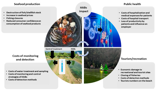 Bivalve mollusc production (e.g., mussels, oysters, scallops, and clams), represents a significant proportion of the seafood industry in Europe and indeed worldwide, estimated to be 17.7 million tons in 2018 [1]. Global exports of molluscs were estimated to be 10.6 billion USD in 2017, with European exports accounting for 20% of global trade. The top European producers are Spain, France, the Netherlands, the United Kingdom, Italy, Portugal and Ireland [2,3]. The production of bivalve molluscs is an important contributor to local economies [1]; however, it is frequently hindered by contamination with marine biotoxins produced naturally by various microalgal species during harmful algal blooms (HABs). HABs typically occur in the warmer months and can have a devastating socio-economic effect and impact on public health [4]. Economic losses caused by HABs can be high, as for example in 2016, the United States seafood industry reported a predicted 900 million USD annual loss due to HABs [5] and are related but not limited to significant delays in shellfish harvesting and commercial sales, the potential destruction or lengthy depuration processes if available of valuable shellfish/fish stock, delayed seeding of new stock, covering of healthcare costs incurred from sick consumers, and in consequence reduced consumer confidence [4] (Figure 1).