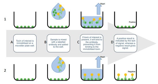 Inhibition-based competitive enzyme-linked immunosorbent assay. (A) The toxin of interest is immobilized in the solid phase on a microtiter plate well. (B) Sample is mixed with a labelled antibody and added to the well. (C1) If the toxin of interest is present in the sample, it will compete with the immobilized toxin to bind to the labelled antibody. (C2) If the toxin of interest is not present, the labelled antibody will bind to the immobilized toxin. (D) Unbound antibody is washed out and the wells imaged. (D1) A positive result is indicated by the lack of signal, because toxin in the sample has prevented the antibody from binding, whereas (D2) a negative result is indicated by a signal, because the labelled antibody has not been inhibited from binding to the immobilized toxin.