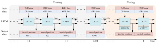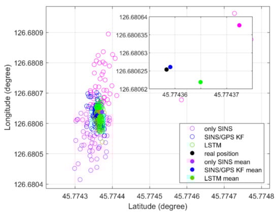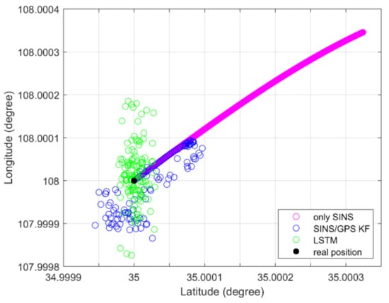 However, as Figure 2 shows, the IMU data are directly fused with GPS position information, without an inertial computer. Thus, there is no accumulation of error due to integration in the proposed method. As Equation (6) shows, the relationship between LSTM input information and LSTM output information is linear. The linear parameters are and . For a trained LSTM net, the structural parameters are constant. The error of LSTM estimation position is dependent on the parameters. The LSTM structure determines that the error of LSTM estimation position is linear. It is well known that suppression of linear error is easier than suppression of nonlinear error. Therefore, the LSTM position estimation method, which only produces linear error, makes the application of inertia information more convenient.