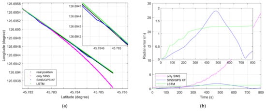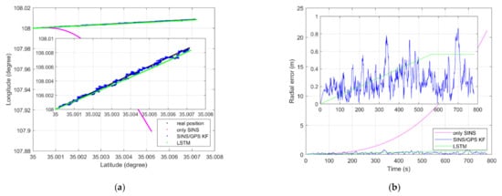 As shown in Figure 9a, an LSTM net can fuse the IMU data and GPS position information to estimate the position information, like the SINS/GPS loosely coupled KF-based system, in a dynamic experiment. Both the LSTM net and loosely coupled based KF can restrain the divergence of only SINS. As shown in Figure 9b, the largest radial error of only SINS, KF method, and LSTM method are 26.71 m, 1.89 m, and 1.31 m, respectively. As Figure 6a,b shows, the position information obtained by only SINS has nonlinear divergence error. The radial error of only SINS will continue to grow over time. However, the position error of KF method and LSTM method does not increase over time. The radial error of the KF method oscillates around 0. The radial error of LSTM method is piecewise linear. Before 450 s, the position information estimated by LSTM has linear divergence error. After 450 s, it becomes constant error. LSTM can enforce constant error through “constant error carousels” within the forgetting gate during enough training steps [23]. The radial error of the LSTM estimation position accords with this conclusion.