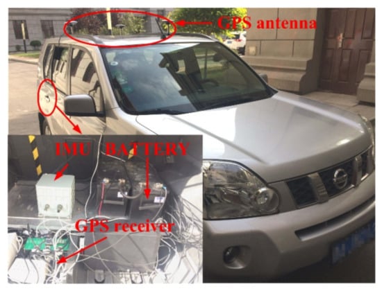 An experimental system was assembled to evaluate the proposed approach, as shown in Figure 7. The experimental equipment included an IMU, a GPS, and a power system on the vehicle. The IMU constituted a three-axis fiber-optic gyroscope with three accelerometers on each gyro-axis. The GPS was UR370 form UNICORE. The IMU, GPS receiver, and power system are in the vehicle trunk. The IMU is fixed on the vehicle via a steel plate that is parallel to the under panel of the vehicle. During the experiment, the IMU and GPS data were recoded. Both IMU data and GPS data included the GPS time. In this study, the GPS provided the position information target. The GPS data and IMU data were synchronized by their GPS times. There were two cases in the experiment, one static and the other dynamic. In static conditions, the vehicle stops 2 min. In dynamic conditions, the vehicle was driving in a uniform rectilinear motion along the road. The driving distance was 450 m and the driving speed was 2 km/s.