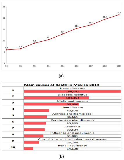 According to data from the American Heart Association (AHA), more than 135 million deaths due to cardiovascular diseases are registered in the world each year [1]. In Mexico, according to the Instituto Nacional de Estadistica y Geografía (National Institute of Statistics and Geography, INEGI in Spanish, Figure 1) [2], a group of heart disorders caused 12.3 deaths per 10,000 inhabitants in 2019, Figure 1a.