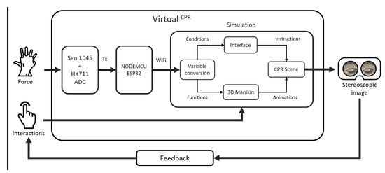 Figure 4 shows the Virtual system, which is a mobile application whose inputs are the force applied by the user to perform the compressions of the CPR technique and interactions through buttons and physical movements during the simulation. The system delivers a stereoscopic image at its output, as an updated window to the virtual world that responds to user actions. The system has a feedback block where the user obtains information from the simulation and modifies the inputs in response.