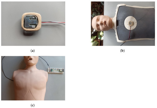 Integration of the Sen-1045 force sensor into a mannequin for CPR. (a) Sen-1045 force sensor, (b) position of the Sen-1045 sensor with respect to the training mannequin and (c) integration of the Sen-1045 sensor and the training mannequin.