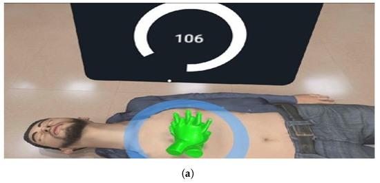 Durai et al. in [15] generated a virtual reality system for the simulation of the CPR procedure. The sensors for tracking position and the optical device to display the image are part of the Oculus Rift hardware system, requiring specialized computer equipment and a force detection plate and, therefore, the use of a mobile application or its deployment in scenarios lacking specialized hardware. Hence, it is an application designed for training. The methodology of this system starts with a force sensor recording the user’s compressions as the main interaction with the simulation, and the system provides information during the procedure using an interface that finally reaches the Oculus Rift device as a stereoscopic image of the virtual world.
