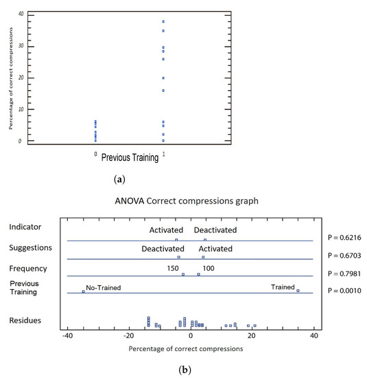 Figure 8a shows that the category of trained users concentrates the highest percentages of correct compressions, pointing out the most significant factor according to multifactorial ANOVA.