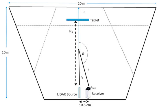 A collinear transmitter–receiver geometry is assumed; thus, both the transmitting and receiving telescopes subtend small, but similar, solid angles. If the transmitted pulse starts at time t = 0 and ends at t = τ, and if we assume that the target subtends a larger FOV than the transmitted illumination, then the received signal power (P), range (R) dependency, is given by: